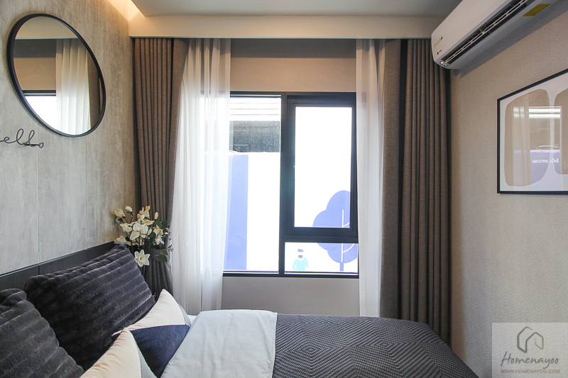 ขนาดห้องกว้างและสว่าง มีหน้าต่างกระจกบานใหญ่ทำให้มีแสงธรรมชาติส่องเข้ามาภายในห้อง ขนาดห้องวางเตียงใหญ่, ตู้เสื้อผ้าและมีมุมชั้นวางของได้
