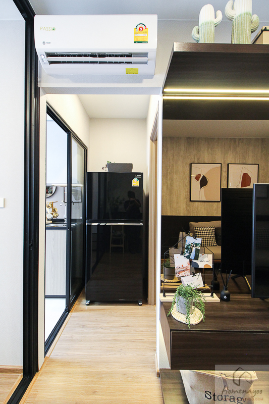 อีกด้านของห้องเป็นห้องน้ำและห้องครัว พื้นที่ระหว่างห้องน้ำและครัวเป็นมุมวางตูเย็น สามารถวางตู้เย็นใบใหญ่ได้