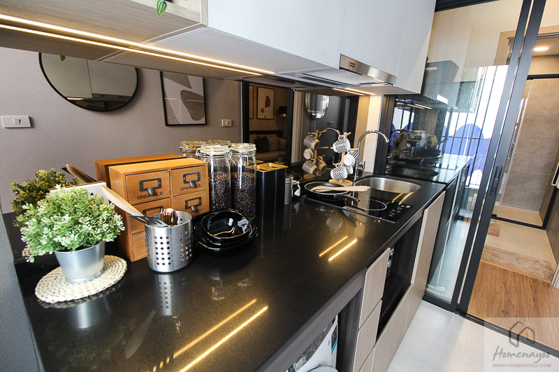 ห้องครัวเป็นครัวปิดเหมาะสำหรับบ้านที่ชอบทำอาหารเพราะกลิ่นจะไม่ฟุ้งออกมานอกห้อง ประตูเป็นประตูกระจกบานเลื่อน กรอบอลูมิเนียมสีดำ กระจกใส