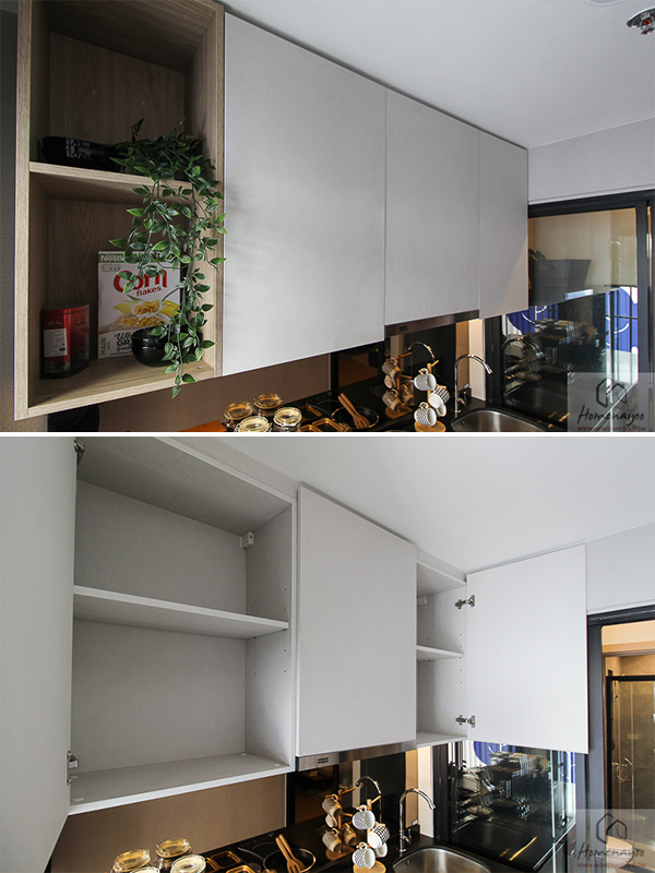 ด้านบนเหนือเคาน์เตอร์ทำเป็นตู้และชั้นวางของ ภายในตู้ก็มีชั้นแบ่งที่สามารถปรับระดับได้