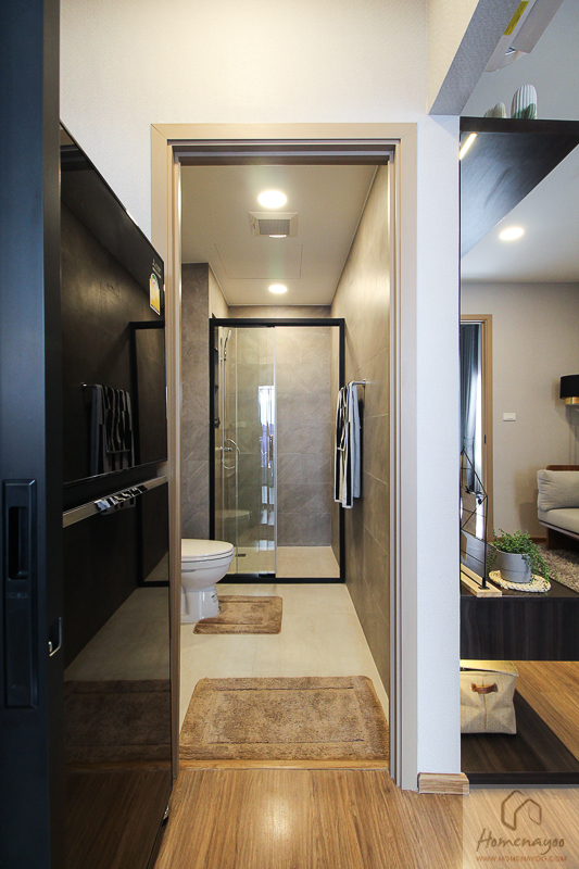 ด้านในสุดเป็นส่วนอาบน้ำ ห้องนี้แยกโซนแห้งและเปียกด้วยฉากกั้นอาบน้ำที่ทางโครงการมีให้