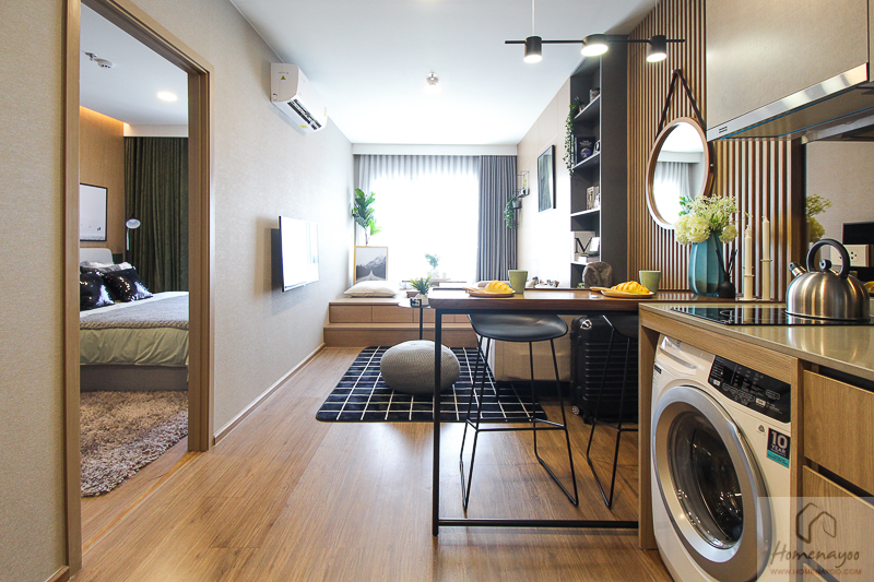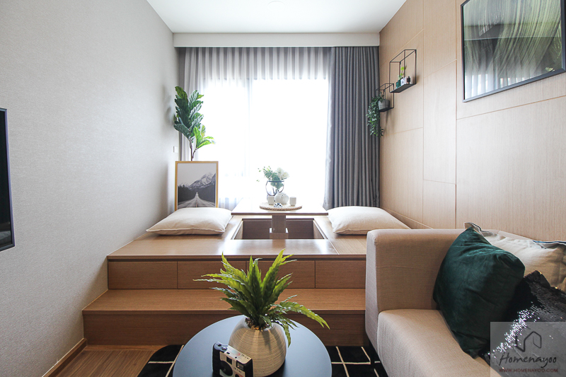 มุมทาทามินี้จะอยู่ติดกับหน้าต่างกระจก ทำให้มีแสงธรรมชาติส่องเข้ามา มุมนี้ยกระดับจากพื้นห้องนั่งเล่นทำให้สามารถทำเป็นลิ้นชักเก็บของได้อีกด้วย หรือถ้าใครไม่อยากให้ตกแต่งส่วนนี้เป็นแบบนี้ก็สามารถบอกทางโครงการได้นะคะ เผื่อบางคนจะทำเป็นมุมโต๊ะทำงานหรือกั้นเป็นห้องทำงาน