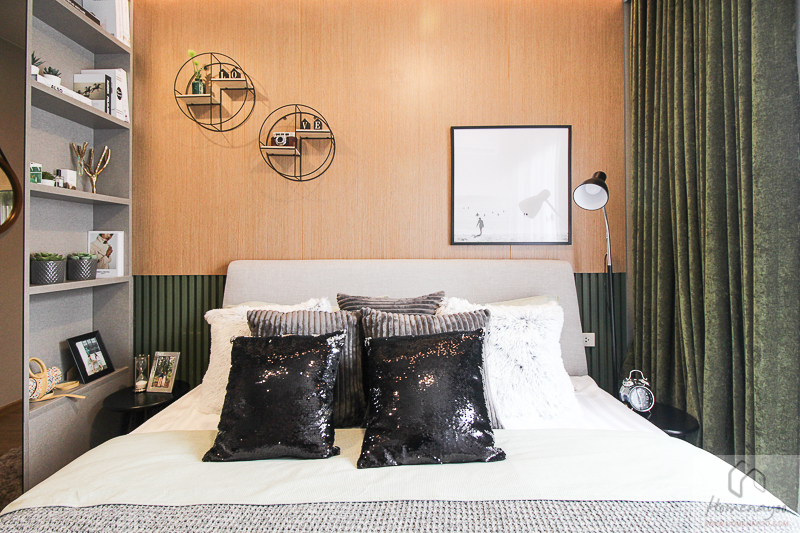 หัวเตียงวางโต๊ะหัวเตียงหรือโคมไฟไว้อ่านหนังสือก่อนนอนได้ทั้งสองข้าง