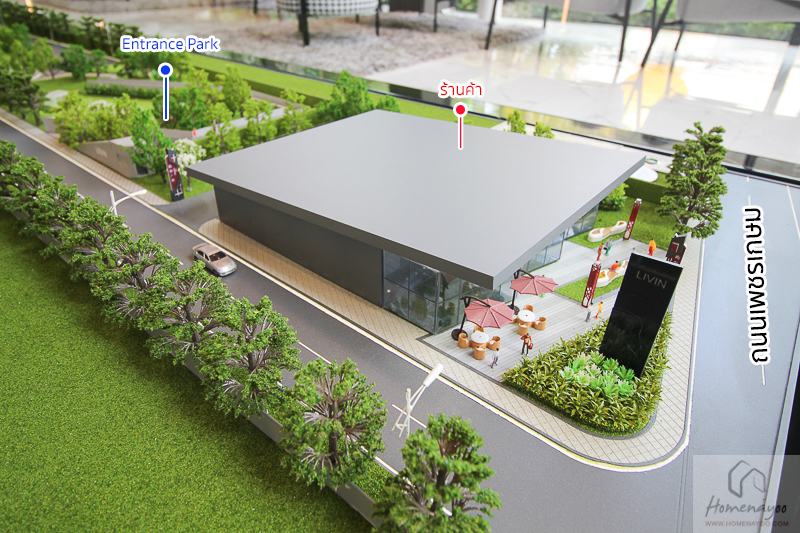 พื้นที่ด้านหน้าติดกับถนนเพชรเกษมจะมีพื้นที่ส่วนกลางที่เป็นร้านค้าและสวนสาธารณะทำให้โครงการดูร่มรื่น