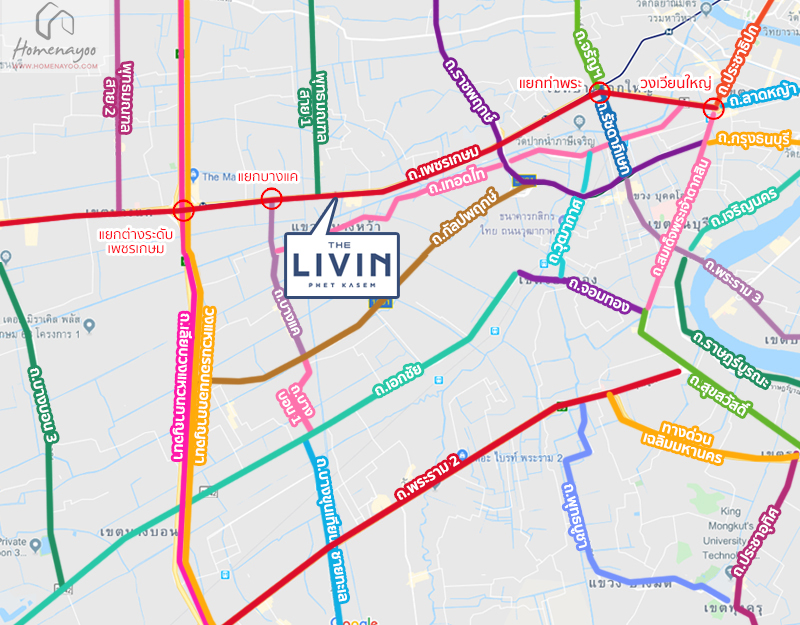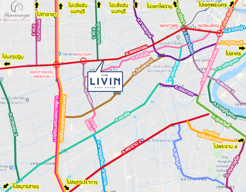 เรามีภาพการเดินทางโดยรถมาให้ชมกัน เส้นทางการเดินทางตามลูกศรเหลือง โดยเริ่มเดินทางจาก จากแยกท่าพระ→ ตรงเข้าเพชรเกษม→ ผ่าน BTS บางหว้า → ผ่าน Seacon บางแค → ตรงไปประมาณ 200 ม. ก็จะเจอพื้นที่โครงการThe Livin เพชรเกษม แล้วค่ะ