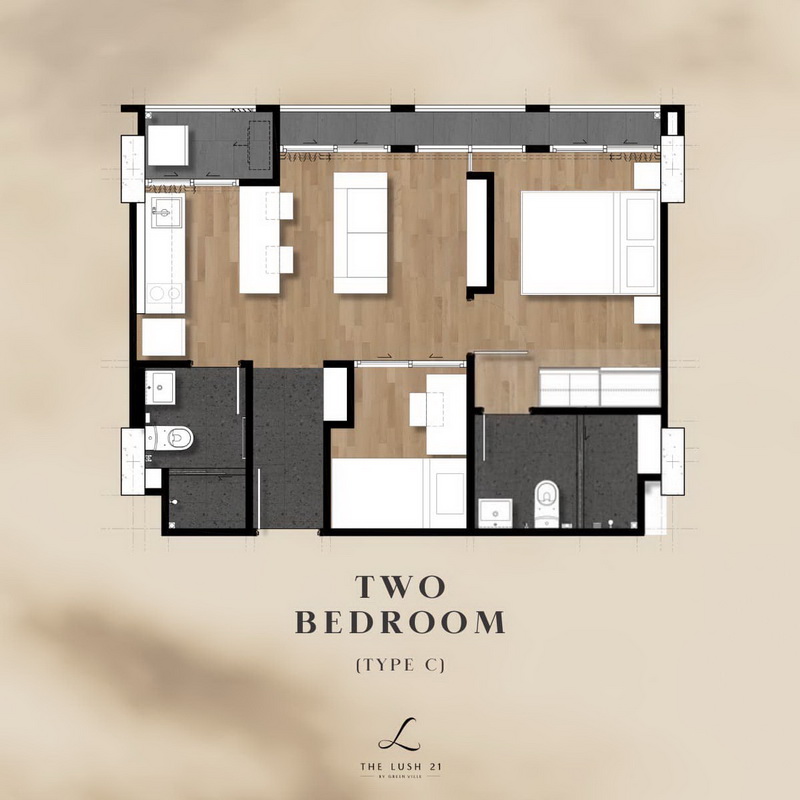 แปลนห้องพัก 2 Bedrooms : Type C ขนาด 47.41-56.34 ตร.ม.