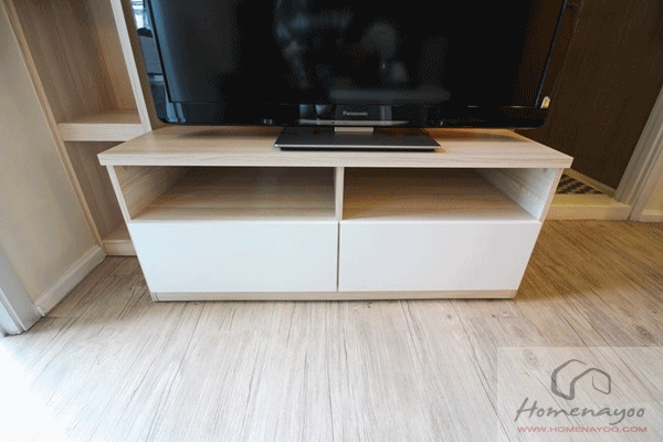 ลักษณะตู้วางทีวี ขนาดกว้าง 1.2 เมตร เป็นตู้แบบมีลิ้นชักคู่ด้านล่าง ช่องด้านบนสามารถวางเครื่องเล่น CD ได้ ด้านหลังมี ปลั๊กไฟและสายอากาศ เดินเอาไว้ให้เรียบร้อย