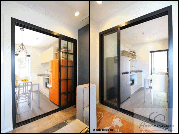 เราจะพาเข้าไปชมกันในห้องครัวก่อนนะคะ ประตูทางเข้าห้องครัววัสดุอลูมิเนียม Power Coat สีดำ กระจกสีเขียวตัดแสง แบบบานเลื่อน 3 ตอน ตามภาพบ้านมาตรฐานขวามือ