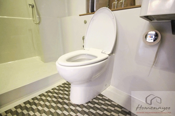 เนื่องจากห้องน้ำทั้งหมดของโครงการนี้ เป็นห้องน้ำสำเร็จรูป สุขภัณฑ์ทั้งหมดยี่ห้อ MOGEN โครงติดตั้งลอยจากระดับพื้นห้อง ดังนั้นพื้นของห้องน้ำจะยก Step ขึ้นไป
