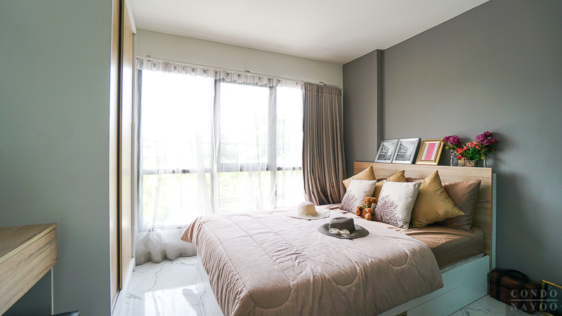ภายในห้องนอนให้พื้นที่มาเยอะพอสมควรสามารถวางเตียง 5 ฟุตได้ มีพื้นที่เหลือข้างเตียงไว้วางของได้อีก