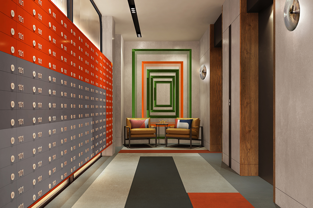 ภาพจำลองบรรยากาศภายใน Life Hall มีลิฟต์โดยสารให้ 2 ตัว พร้อม Mailbox สีสันสดใส และ Waiting Area
