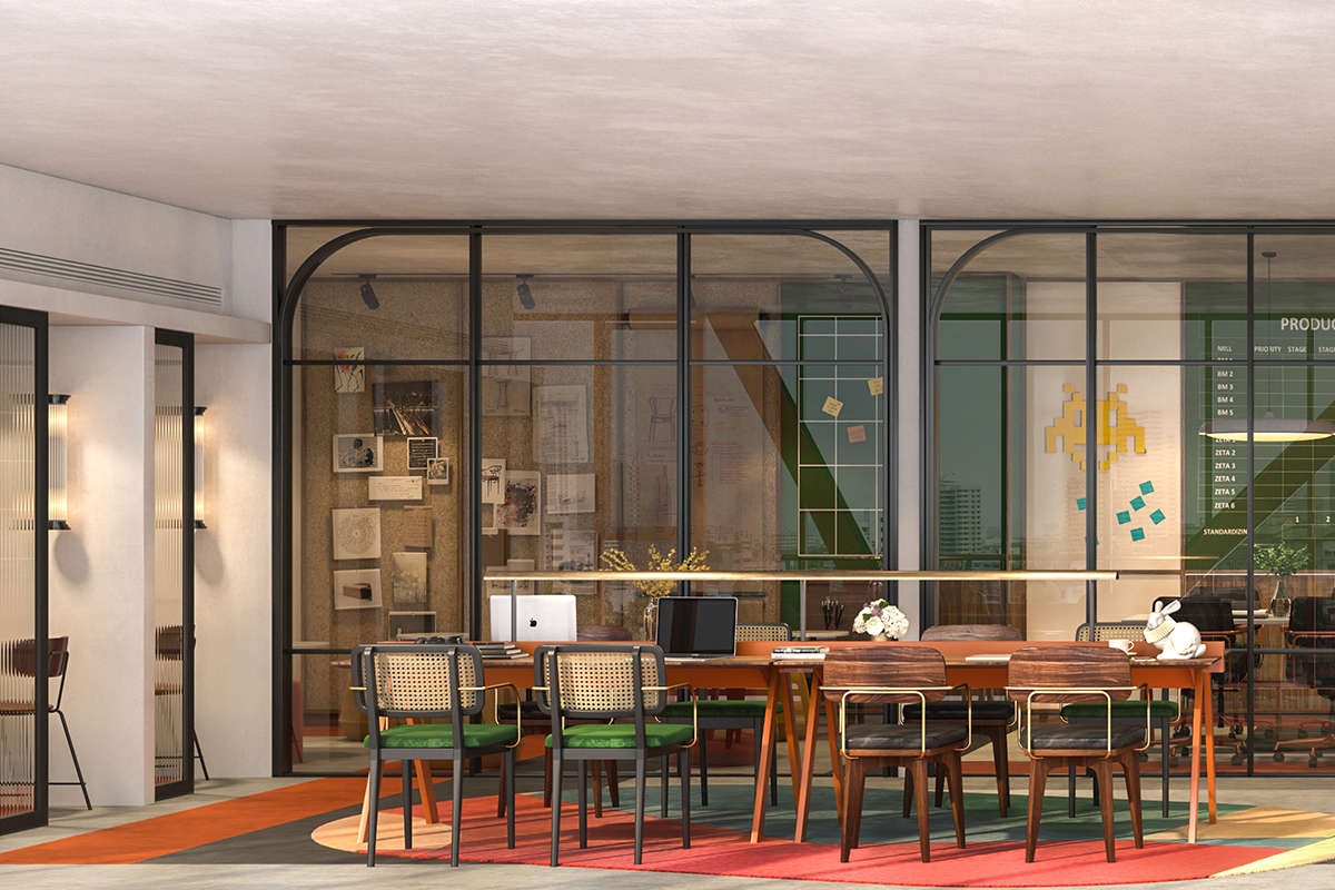 ภาพจำลองบรรยากาศภายใน Semi-Outdoor Lobby ที่มีพื้นที่ต่อเนื่องมาจากทางเข้าหลัก ออกแบบให้เชื่อมกันทั้งเส้นสายและลายกราฟิก ใช้วัสดุและเฟอร์นิเจอร์ที่ให้ความรู้สึกถึงงานคราฟท์ ปลายสายตาสามารถมองเห็นต้นไม้ใหญ่ในสวน ให้ความรู้สึกผ่อนคลายสบาย ๆ เอาไว้นั่งคุยกับเพื่อน หรือคุยงานกันแบบเบา ๆ โดยไม่ต้องเข้าไปในโครงการ