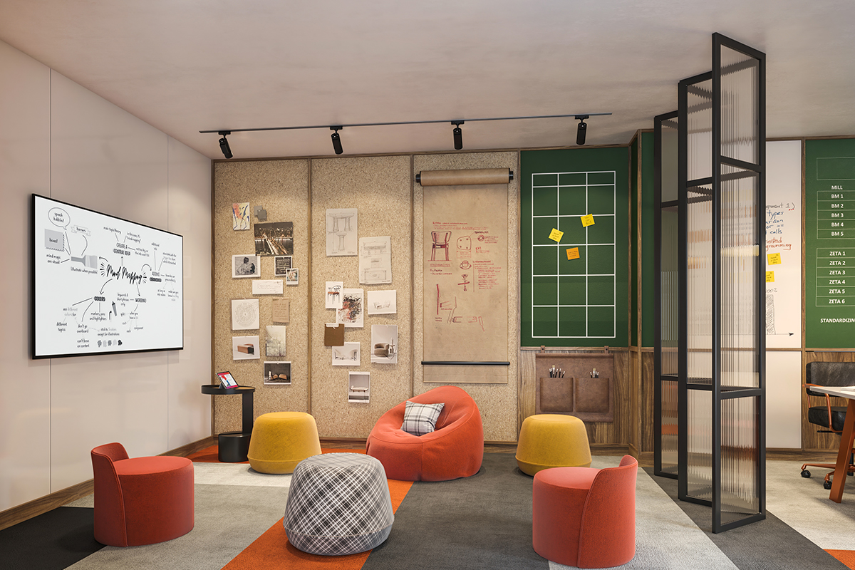 ภาพจำลองบรรยากาศภายใน Co-Living Space มีพื้นที่ทั้ง 2 แบบให้คุณได้เลือกใช้ จะพูดคุยสบายๆ กับเพื่อน หรือนั่งดูซีรี่ส์ ก็มีตู้ขนมและเคาน์เตอร์กาแฟไว้รองรับ หรือถ้าอยากนั่งทำงานจริงจัง โซนใกล้ ๆ กัน ก็มีทั้งโต๊ะทำงาน ห้องประชุม พร้อมกระดาน และจอทีวี ที่พร้อมสำหรับทุกการ BRAINSTORM โปรเจกต์ใหม่ๆ ของคุณ