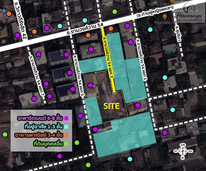 ส่วนรอบ ๆ ที่ดินจะเป็นตึกแถวทาวน์เฮาส์ 2-3 ชั้น, หอพัก, อะพาร์ตเมนต์เป็นส่วนใหญ่ เพราะอยู่ใกล้กับมหาวิทยาลัย และ หน่วยงานราชการ บรรยากาศรอบ ๆ มีความเงียบสงบตลอดทั้งวัน ส่วนตอนเช้าและตอนเย็น จะมีรถวิ่งผ่านเส้นซอยงามวงศ์วาน 54 อยู่บ้าง แต่ก็ไม่เยอะมากเมื่อเทียบกับซอยรองอื่น ๆ ในเมืองค่ะ