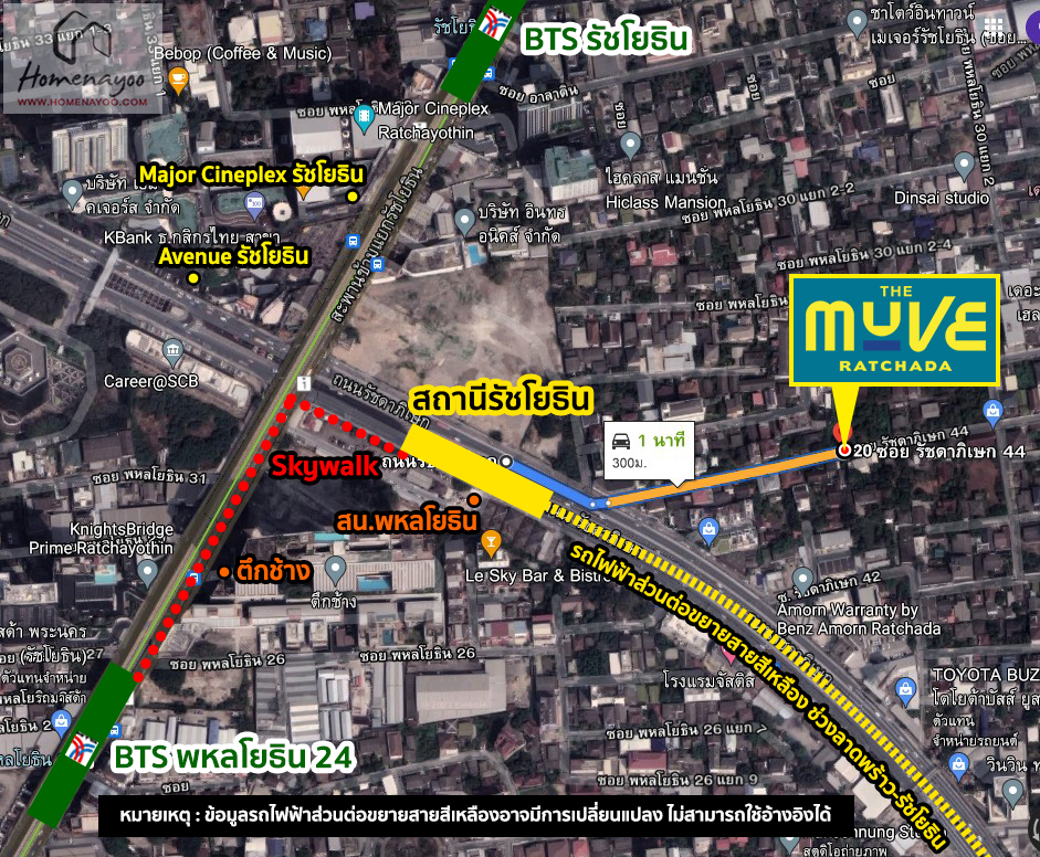 การเดินทางเริ่มจากแยกเกษตร ⇒ ถ.พหลโยธิน ⇒ แยกรัชโยธิน ⇒ ถ.รัชดาภิเษก ⇒ ซ.รัชดาภิเษก 44 ⇒ The Muve Ratchada