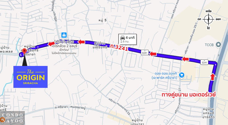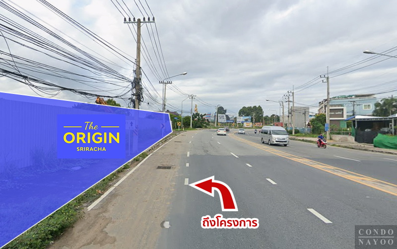 ทางคู่ขนานมอเตอร์เวย์ ⇒ ถนนสาย 3241 ⇒ 2 กม.* ถึงโครงการ The Origin ศรีราชา ทางฝั่งซ้ายมือ