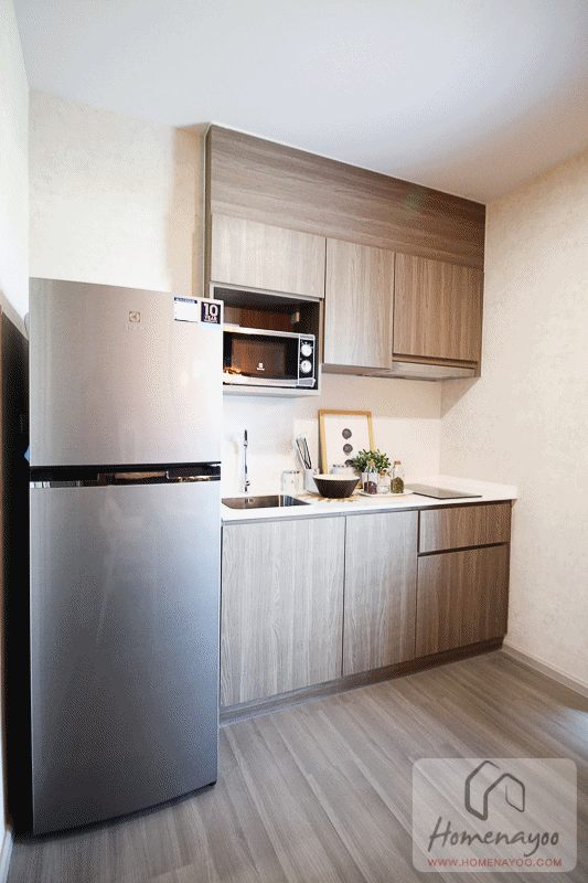 ตัวห้องขายแบบ Fully Fitted พร้อมฉากกั้นห้องน้ำ สุขภัณฑ์ ชุดครัว เตาไฟฟ้า ฮู้ดดูดควัน ซิงค์ ตู้เสื้อผ้า เครื่องทำน้ำอุ่น digital door lock และเครื่องปรับอากาศ ส่วนห้องตัวอย่างจะเป็นอย่างไรไปชมกันเลยค่ะ