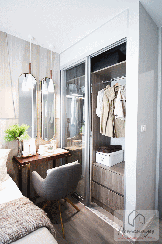 ข้างเตียงวางโต๊ะเครื่องแป้งพร้อมตู้เสื้อผ้ามาให้ดูระยะใช้งาน
