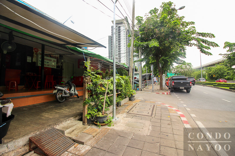ถนนทางเท้าจากรถไฟฟ้า bts ไปยังโครงการค่อนข้างกว้างค่ะ ฝั่งซ้ายมือจะมีร้านอาหารอยู่เรื่อยๆ เป็นระยะ ที่เห็นก็จะเป็นร้านอาหารไทยอีสาน เชฟแจ็คค่ะ