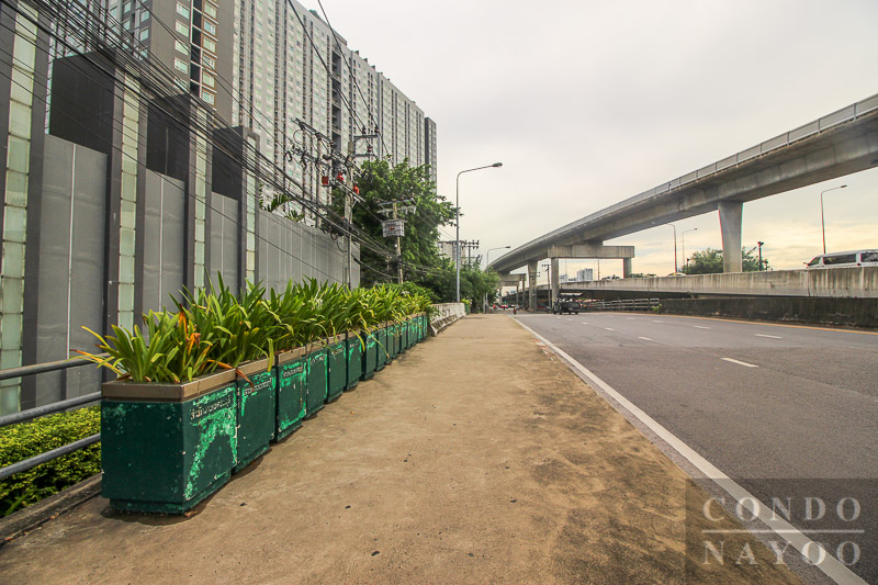 โครงการอยู่ติดหน้าสะพานข้ามแยกรัชดา-ท่าพระพอดีเลยค่ะ ซึ่งหากต้องการข้ามถนน ต้องเดินไปข้ามที่ทางแยกพอดี จะมีทางม้าลายอยู่