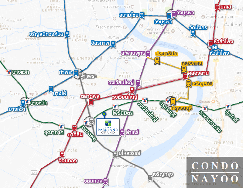 โครงการ The Parkland Grand ตากสิน ตั้งอยู่ติดถนนใหญ่ ถนนราชพฤกษ์ ฝั่งฝั่งมุ่งหน้า ถ.รัชดา-ท่าพระ ค่ะ ซึ่งเป็นโครงการสร้างเสร็จต่อจาก The Parkland ตากสิน-ท่าพระ อยู่ข้างกันเลยถัดไปทางฝั่งทิศตะวันตก และอยู่ห่างจากรถไฟฟ้า BTS สถานีโพธิ์นิมิตรไปทางทิศตะวันออกเพียง 450 เมตรเท่านั้น และอยู่ห่างจากบันไดทางขึ้นสถานี BTS ตลาดพลู 350 เมตรค่ะ