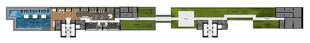 สำหรับส่วนกลางในอาคารพักอาศัย กระจายไว้ตามชั้นต่างๆ เพื่อให้ลูกบ้านในแต่ละชั้นใช้งานได้อย่างสะดวกทั่วถึงกัน เริ่มจากชั้นล่างเป็น Main Lobby, Mailbox, Meeting Room ขึ้นไปชั้น 8 มีสระว่ายน้ำขนาดใหญ่ 50 x 12 เมตร + สระเด็ก 10 x 12 เมตร, ชั้น 9 เป็นสวนพักผ่อน ขึ้นไปชั้น 60 มี 270′ Infinity Edge Sky Pool ขนาด 25x 12 เมตร, ห้องฟิตเนส 2 ชั้น และสวนหย่อม