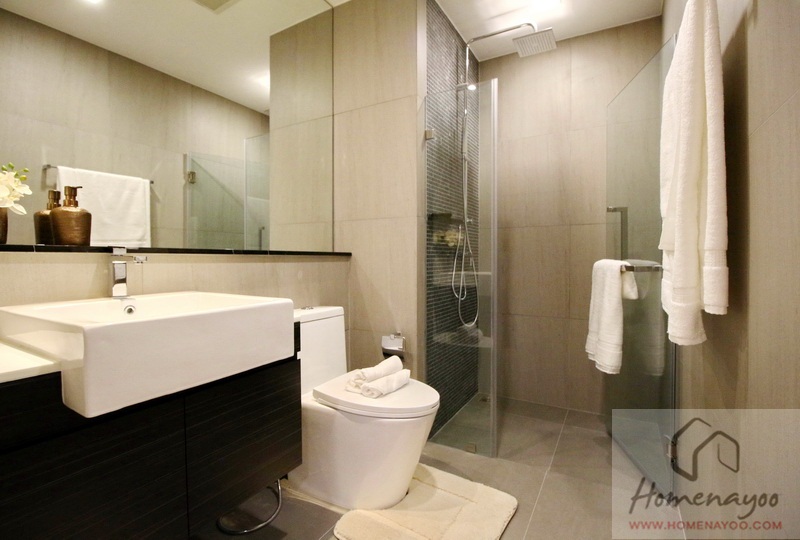 ส่วนแบบ 2 ห้องนอน 2 ห้องน้ำ ขนาด 60.00 ตร.ม. โครงการขายห้องพักแบบ Fully Furnished โดยลูกค้าจะได้เฟอร์นิเจอร์บิวท์อิน BY Euro Creation, เคาน์เตอร์ครัว Hi-Gloss พร้อมเตาเซรามิค+เครื่องดูดควัน+ซิงค์ล้างจาน 2 หลุม ของ Teka ผนังห้องวอลล์เปเปอร์ พร้อม เครื่องปรับอากาศ Toshiba 3 เครื่อง
