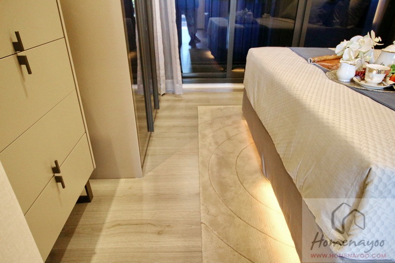 ขวามือวางเตียงนอนขนาด 5 ฟุต ให้ดูเป็นไอเดีย ส่วนหัวเตียงทางโครงการตกแต่งบุนวมเอาไว้ให้ หน้าต่างภายในห้องนอน แบบ Bay Windows ขนาดใหญ่ เปิดรับวิวได้กว้างกว่าหน้าต่างกระจกธรรมดาทั่วไป โดยแบ่งฟังก์ชั่นเป็นแบบบาน Fix และ บานเลื่อน