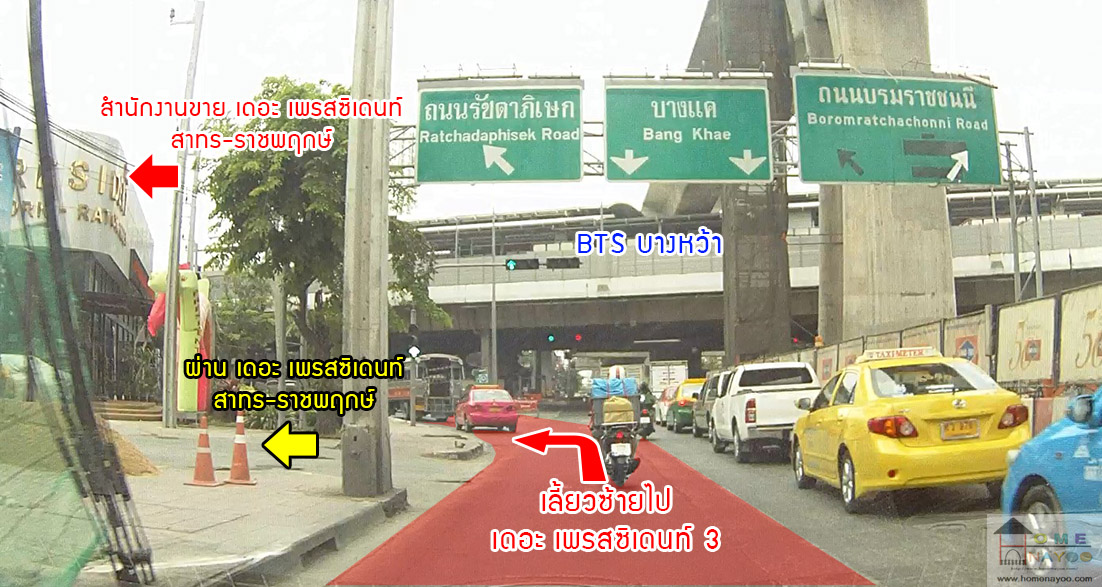จากนั้นจะเห็นอาคาร เดอะ เพรสซิเดนท์ สาทร-ราชพฤกษ์ จะอยู่ทางซ้ายมือ ก่อนถึง แยก BTS บางหว้า