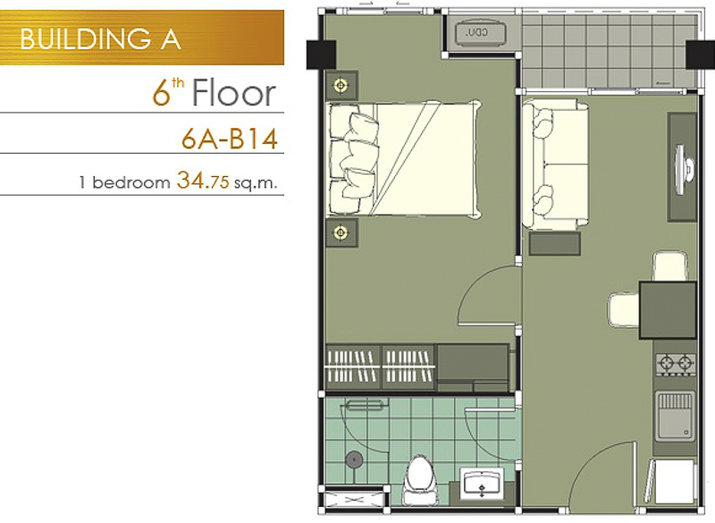 เปิดประตูเข้ามาจะเจอส่วนครัวก่อนเลย ได้เป็นครัวเปิดเชื่อมกับส่วนห้องนั่งเล่น ด้านในสุดเป็นระเบียง ซ้ายมือเป็นห้องน้ำ และห้องนอน พื้นห้องครัวและห้องนั่งเล่นเป็นกระเบื้องแกรนิตโต้ขนาด 60 x 60 ซม. ส่วนห้องนอนเป็นไม้ลามิเนตหนา 8 มม. ฝ้าสูง 2.6 ม. ผนังได้ฉาบเรียบทาสีทั้งห้อง
