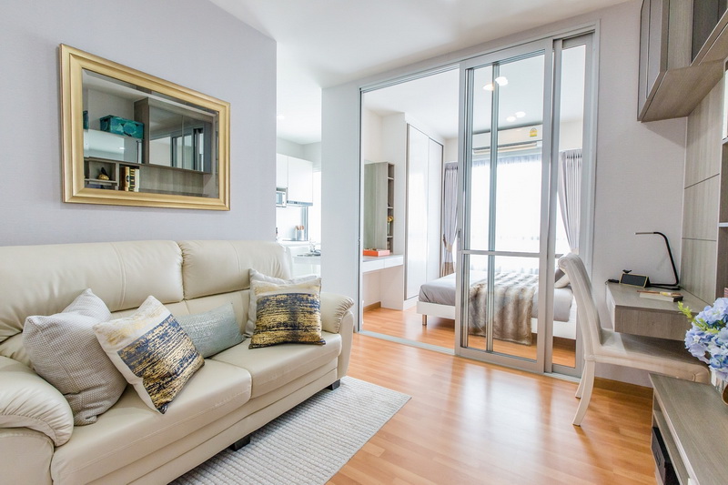 ห้องนั่งเล่นขนาดพอเหมาะ วางโซฟา 2 ที่นั่ง, โต๊ะกลาง และ ชั้นวางทีวีขนาดมาตรฐานได้ ถัดออกไปเป็นระเบียงขนาดค่อนข้างกว้าง ประตูระเบียงเป็นกระจกใสตัดแสง เปิดรับแสงสว่างเข้ามาในห้องได้เต็มที่ และช่วยให้ห้องพักดูโปร่ง โล่ง และกว้างขึ้น