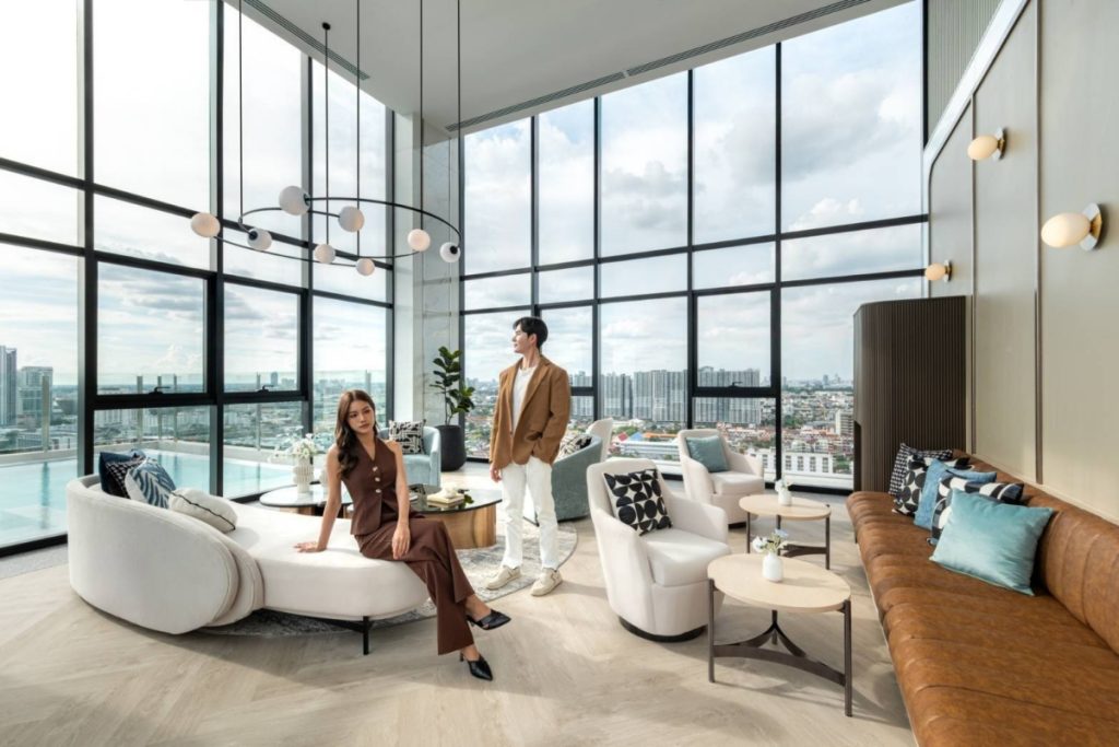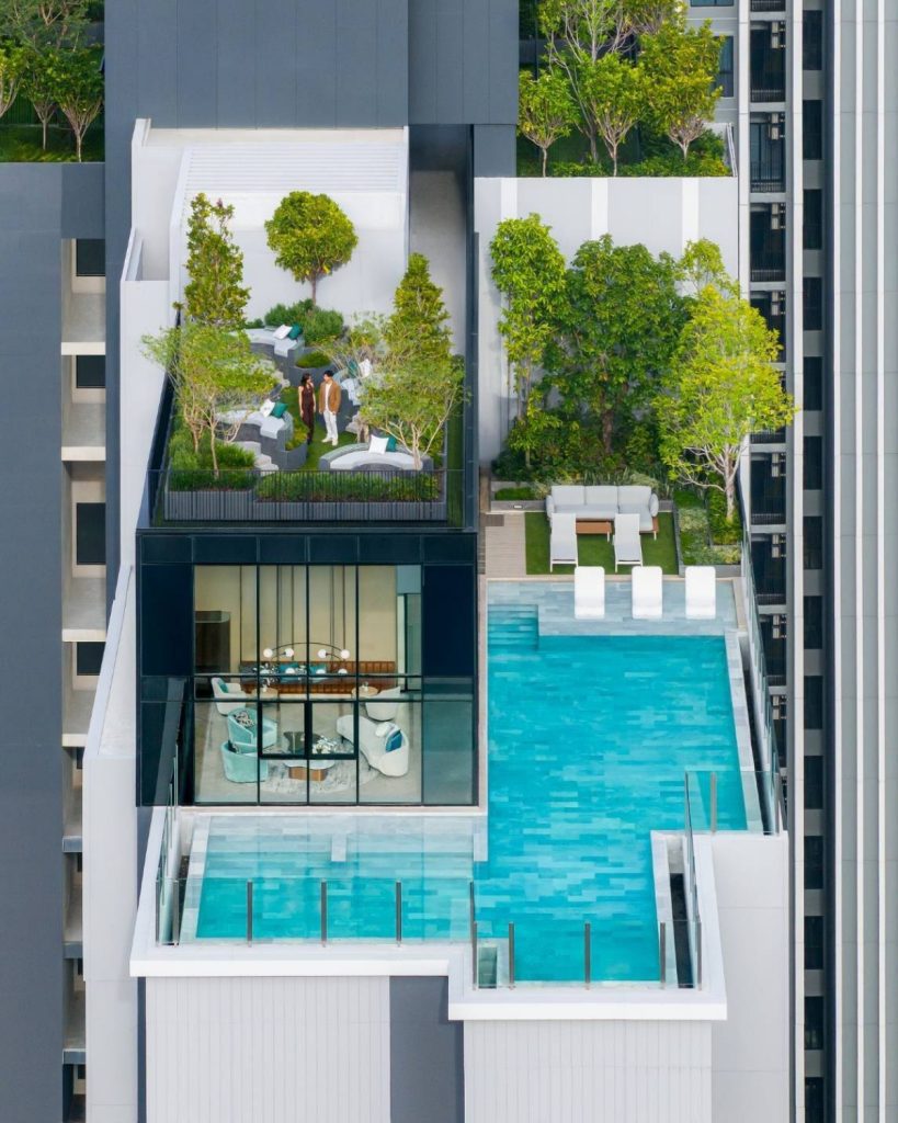 Highlight อีกจุดของส่วนกลางโครงการนี้ คือ จะมี Top Floor Facilities ต่อเนื่องถึง 3 ชั้น จัดฟังก์ชันมาให้หลากหลาย เช่น Lap pool สระว่ายน้ำระบบน้ำเกลือ ขนาดประมาณ 9 x 23 ม., Pool Terrace, Jacuzzi, Sky Lounge, Fitness, Edible Garden, Cloud Garden, Rooftop Lawn โดยแต่ละจุดจะสามารถรับชมวิวเมืองและวิวโค้งแม่น้ำเจ้าพระยาได้อีกด้วยค่ะ ทั้งหมดนี้ในราคาเริ่มต้นเพียง 2.59 ล้านบาท* (ต.ค. 68) | เปิดให้เข้าชมห้องตัวอย่างได้