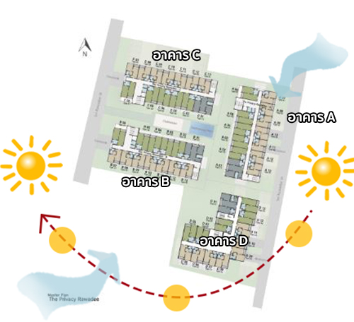 การวางผังของอาคาร A, B, C จะเหมือนกัน มีเฉพาะอาคาร D ที่มีลักษณะเป็นตัว L ป้อมๆ โดยทุกอาคารชั้น 1 จะเป็นพื้นที่จอดรถและ Lobby + นิติบุคคลของแต่ละอาคาร ส่วนชั้น 2 – 7 จะเป็นห้องพักอาศัยเหมือนกันทุกชั้น จากการวางตัวอาคารและลองวางทิศทางแดดลมฝนดู จะสามารถประมาณได้ว่าทั้งโครงการอาคารที่ร้อนในช่วงบ่ายถึงเย็นจะเป็นอาคาร B และ C โดยเฉพาะฝั่งที่หันหน้าเข้าหาซอยเรวดี 18 เพราะอาคารตั้งอยู่ทางทิศตะวันตก ส่วนอาคาร A และ D จะได้รับแดดในช่วงเช้าถึงเที่ยงเยอะ ทำให้ค่อนข้างร้อนกว่าในเวลากลางวันแต่ช่วงเย็นกลับมาห้องจะไม่ร้อนค่ะ
