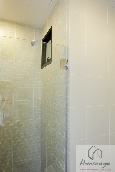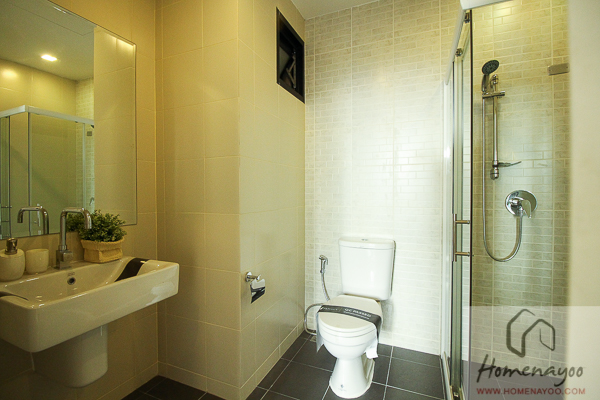 ห้องน้ำของ Type B จะได้พื้นที่เพิ่มขึ้น พร้อมห้องอาบน้ำที่กั้นเป็นสัดส่วน นอกจากนั้นยังสามารถเข้าได้ทั้งจากทางห้องนอนและห้องครัว ส่วนสุขภัณฑ์จะเหมือนกับห้องที่แล้วค่ะ