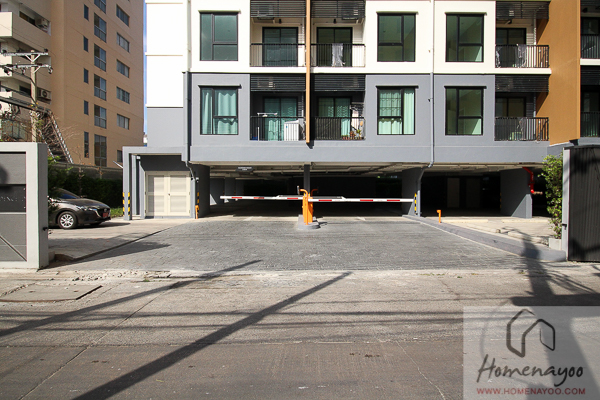 ทางเข้าอาคารเป็นไม้กระดกเข้าไปยังที่จอดรถใต้อาคารเลย ไม่มีซุ้ม