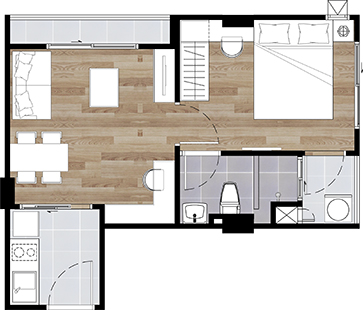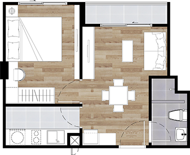 | ลักษณะห้องและขนาดห้อง | 1 ห้องนอน ขนาด 22.5-33.5 ตร.ม. |
