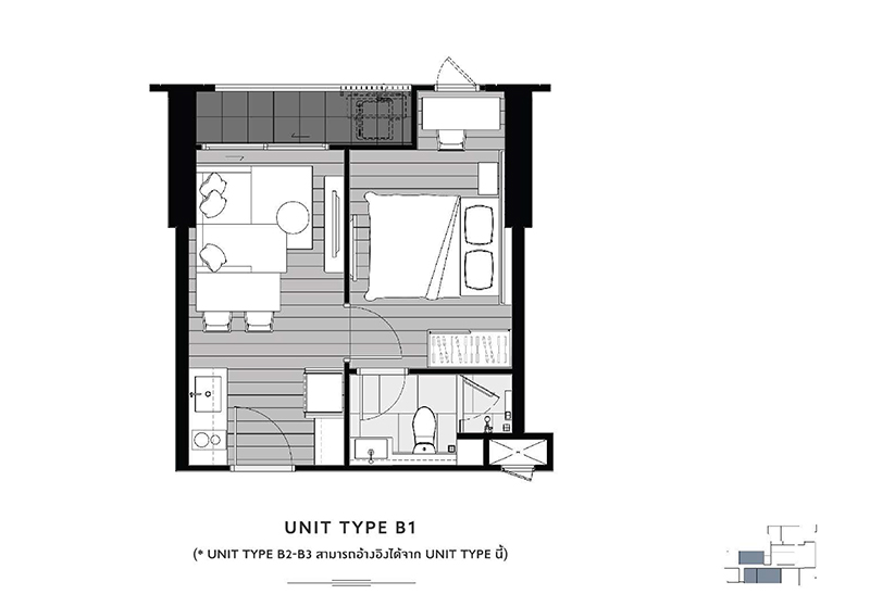 พื้นที่ห้องครัวจะถูกจัดเป็นมุมไว้เป็นสัดส่วน รวมอยู่กับพื้นที่ทานอาหาร ทางโครงการจะติดตั้งเคาน์เตอร์ทั้งชุดมาให้เป็นมาตรฐาน ซึ่งดูจากการจัดวางแล้วเราสามารถที่จะกั้นห้องแยกเป็นครัวปิดได้ค่ะ