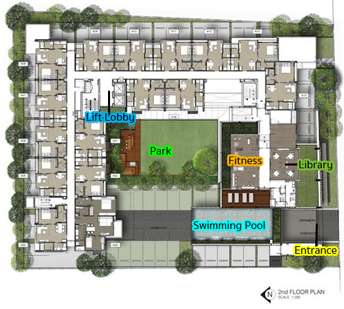 Master Plan สำหรับแปลนโครงการนั้นจะเริ่มที่ชั้น 2 เนื่องจากชั้นล่างจะเป็นชั้นของลานจอดรถทั้งหมด ตำแหน่งของ Facilities ต่างๆสามารถดูได้ตามกราฟิกในภาพเริ่มจาก ตัวโครงการมีลักษณะเป็นรูปตัว U ทางเข้าออกโครงการ อยู่ทางฝั่งมุมขวาล่าง เข้ามาด้านในจะมีสระว่ายน้ำ, ฟิตเนส และห้องสมุดอยู่ที่ชั้น 2 ตัวอาคารโอบล้อม Court ตรงกลางที่เป็นพื้นที่สวนหย่อมและ Pavillion สำหรับให้ลูกบ้านมานั่งเล่น