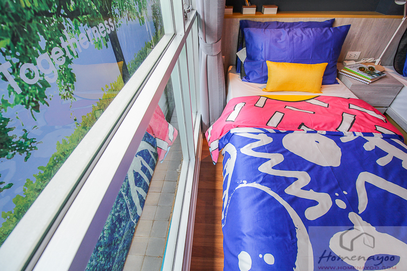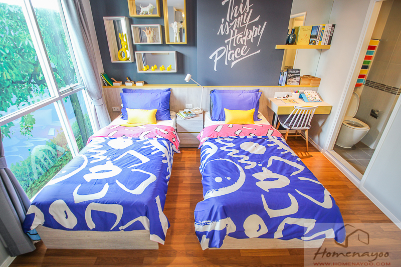 วางเตียงเดี่ยว 2 เตียงมาให้ดู หรือจะวางเตียง King Size ก็ได้ครับ ห้องตัวอย่างตกแต่งไว้เป็นไอเดียสำหรับปล่อยเช่าให้น้องๆนักศึกษาได้เลย