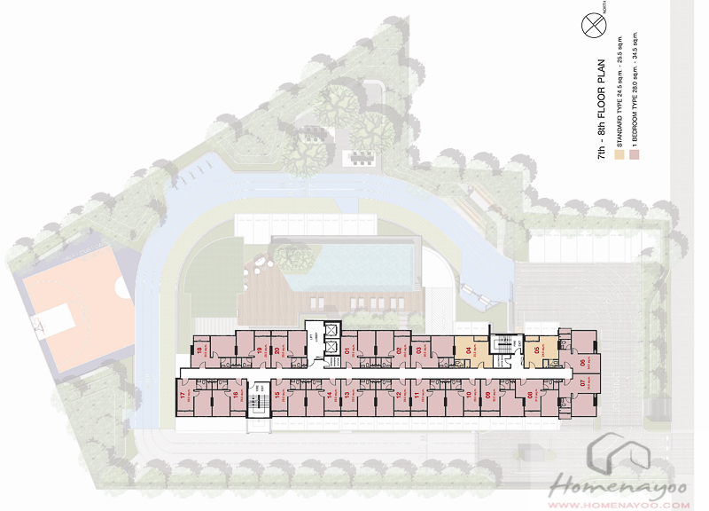 แปลนชั้น 5 จะเริ่มเป็นชั้นพักอาศัย นับได้ทั้งหมด 16 ยูนิต ตำแหน่ง 01 จะเป็นห้อง 2 Bed มีห้องเดียวทั้งโครงการ และตำแหน่ง 04, 05 จะเป็นห้อง Studio ที่เหลือจะเป็นห้อง 1 Bed ทั้งหมดครับ ชั้นนี้จะมีส่วนกลางด้วย แบ่งเป็นสระว่ายน้ำระบบเกลือขนาด 15 x 8 ม. ฟิตเนส และห้องน้ำแยกชายหญิง
