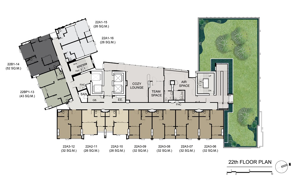 ขึ้นไปชั้น G, 6, 22, 27 และ 31 จัดพื้นที่สีเขียวมาให้มากถึง 5 จุด เลือกใช้ได้ตามความต้องการ พร้อมพื้นที่สำหรับออกกำลังกาย อย่าง Yoga Room, Half Basketball Court, Outdoor Fitness Equipment, Foot Reflexology และ Club 31 Fitness ที่ใช้เครื่องออกกำลังกายแบรนด์ชั้นนำจาก Technogym มีพื้นที่ให้พบปะสังสรรค์กับเพื่อน ๆ, พื้นที่นั่งทำงาน และ Brainstorm งานเจ๋ง ๆ อย่าง Creative Space, Cozy Lounge, Team Space, Air Space