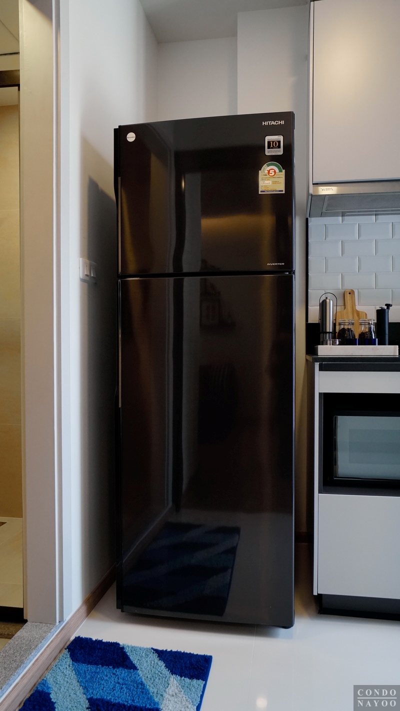 ข้างชุดครัวมีพื้นที่เหลือประมาณ 75 ซม. รองรับการวางตู้เย็นขนาด 8-10 คิว ได้ และที่ผนังด้านหลังจะมีเต้าเสียบปลั๊กไฟติดมาให้พร้อมต่อใช้งาน