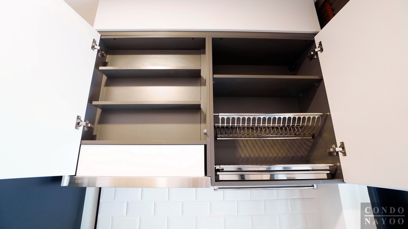 เปิดลิ้นชักและบานตู้ต่าง ๆ ออกให้ดู ได้ฟังก์ชันการใช้งานมาครบเลย ทั้งลิ้นชักเก็บของ, ลิ้นชักพร้อมถาดใส่ช้อน-ส้อม, ตู้เก็บของใต้ซิงค์ล้างจาน, ชั้นวางไมโครเวฟ รวมถึงชั้นลอยต่าง ๆ ก็มีให้เยอะ และยังมีถาดสแตนเลสสำหรับวางจาน ชาม มาให้ด้วยค่ะ