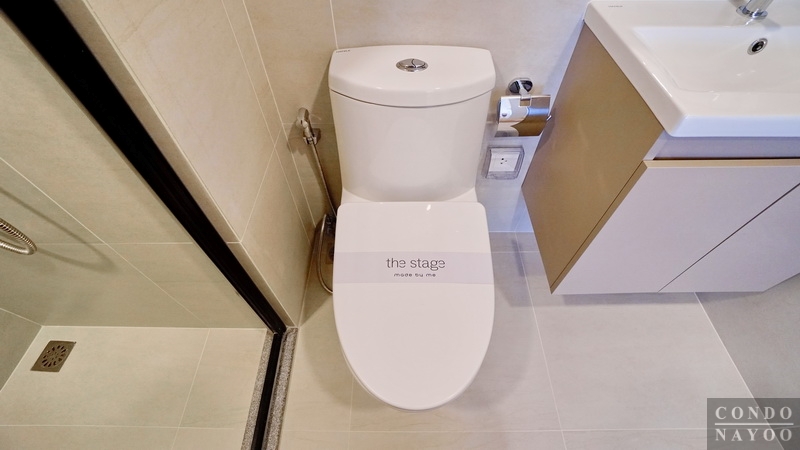ถัดมาเป็นโถสุขภัณฑ์ One Piece ระบบ Dual Flush พร้อมสายฉีดชำระ, ที่แขวนกระดาษทิชชู่สแตนเลส และมีเต้าเสียบปลั๊กไฟ พร้อมฝาครอบกันน้ำให้ 1 จุด รองรับการต่อใช้ Gadget ต่าง ๆ หรือจะใช้ชาร์จแบตเตอรี่มือถือ, ไดร์เป่าผม และเครื่องโกนหนวดก็ได้