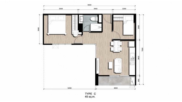 | ลักษณะห้องและขนาดห้อง | – 1 Bedroom : 27, 31 ตร.ม. – 2 Bedrooms : 45, 60 ตร.ม. |