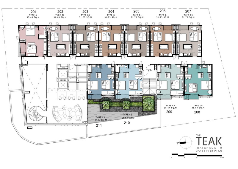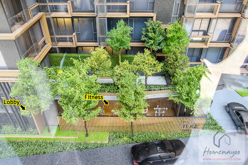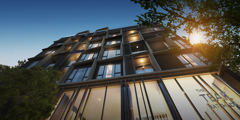 ภาพจำลองบรรยากาศโครงการ The Teak รัชดา 19 ตัวอาคารใช้โทนสีเอิร์ธโทน ซึ่งเป็นโทนสีธรรมชาติอย่างสีน้ำตาลเหมือนสีของไม้ สีเทาเข้มจากหิน เป็นต้น