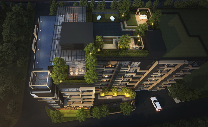 ภาพจำลองบรรยากาศโครงการ The Teak รัชดา 19 จะเห็นว่าเปลือกอาคารมีกรอบหรือเส้นตัดอาคารลายไม้ ช่วยสร้างมิติและเส้นนำสายตาให้อาคาร