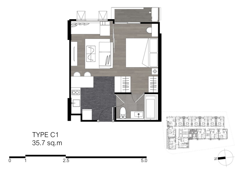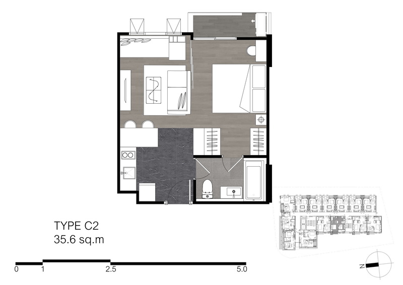 ห้องตัวอย่างที่เราพาไปชมกันห้องแรกเป็นห้อง 1 ห้องนอน TYPE C3 ขนาด 35.6 ตร.ม. ตัวแบ่งส่วน Private และ Public มาด้วยการจัดโซนและใช้ฉากกั้นห้องแบบบานเลื่อน โดยเข้ามาจะเป็นส่วนครัว เดินตรงไปเป็นส่วนห้องนั่งเล่น มีห้องน้ำมาให้กลางห้อง ทำให้แขกสามารถใช้ห้องน้ำได้ โดยไม่ต้องผ่านห้องนอน ขณะเดียวกันก็ประตูที่เปิดเข้ามาส่วนห้องนอนได้ ด้วย โดยห้องน้ำจะมีอ่างอาบน้ำมาให้ ซึ่งในระดับห้องแบบ 1 ห้องนอนราคานี้ จัดว่าหาโครงการที่ให้อ่างอาบน้ำมาด้วยได้ยากมากค่ะ