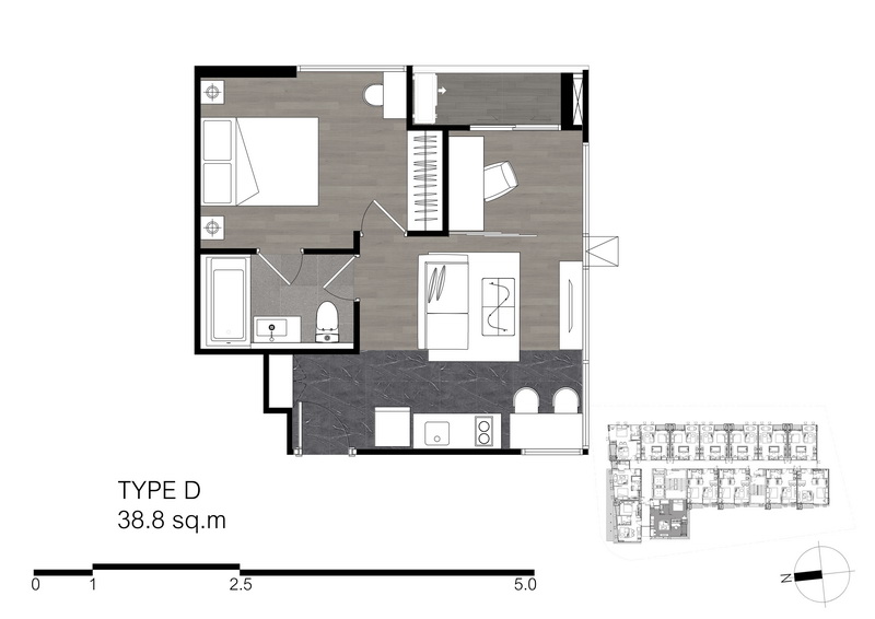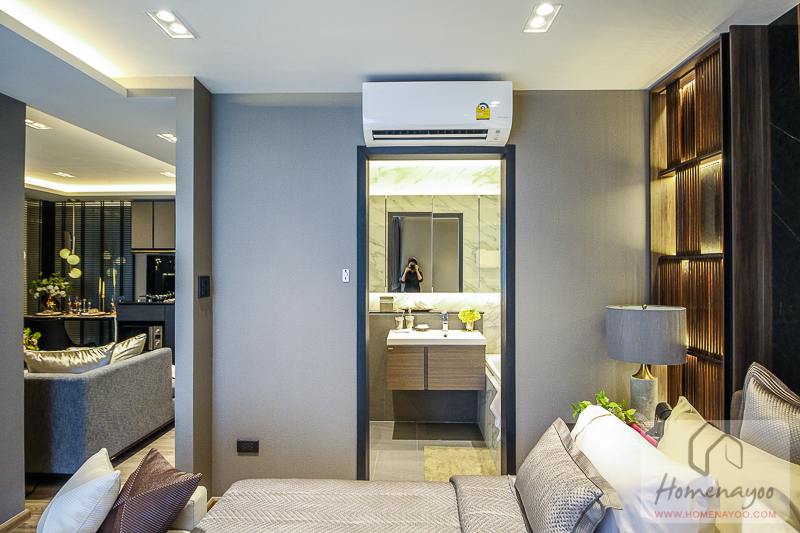 ห้องตัวอย่างที่เราพาไปชมกันห้องที่สองเป็นห้อง 1 Bedroom Plus TYPE D ขนาด 38.8 ตร.ม. ตัวแบ่งส่วน Private และ Public มาด้วยการจัดโซนและใช้ฉากกั้นห้องแบบบานเลื่อน โดยเข้ามาจะเป็นส่วนครัว ถัดไปเป็นส่วนห้องนั่งเล่น ที่ มีห้องน้ำมาให้กลางห้อง ทำให้แขกสามารถใช้ห้องน้ำได้ โดยไม่ต้องผ่านห้องนอน ขณะเดียวกันก็มีประตูบานปิดที่เปิดเข้ามาส่วนห้องนอนได้ ด้วย โดยห้องน้ำจะมีอ่างอาบน้ำมาให้ ซึ่งในระดับห้องแบบ 1 ห้องนอนราคานี้ จัดว่าหาโครงการที่ให้อ่างอาบน้ำมาด้วยได้ยากมากค่ะ