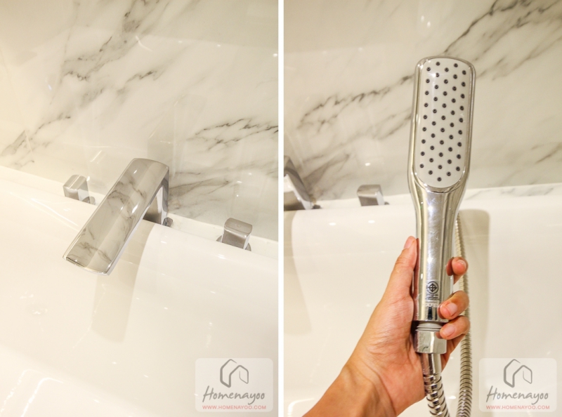 ฝักบัวและก็อกน้ำเป็นของ Hafele ขนาดกำลังเหมาะมือ ก็อกน้ำมีตัวหมุนเปิดน้ำร้อนน้ำเย็นมาให้